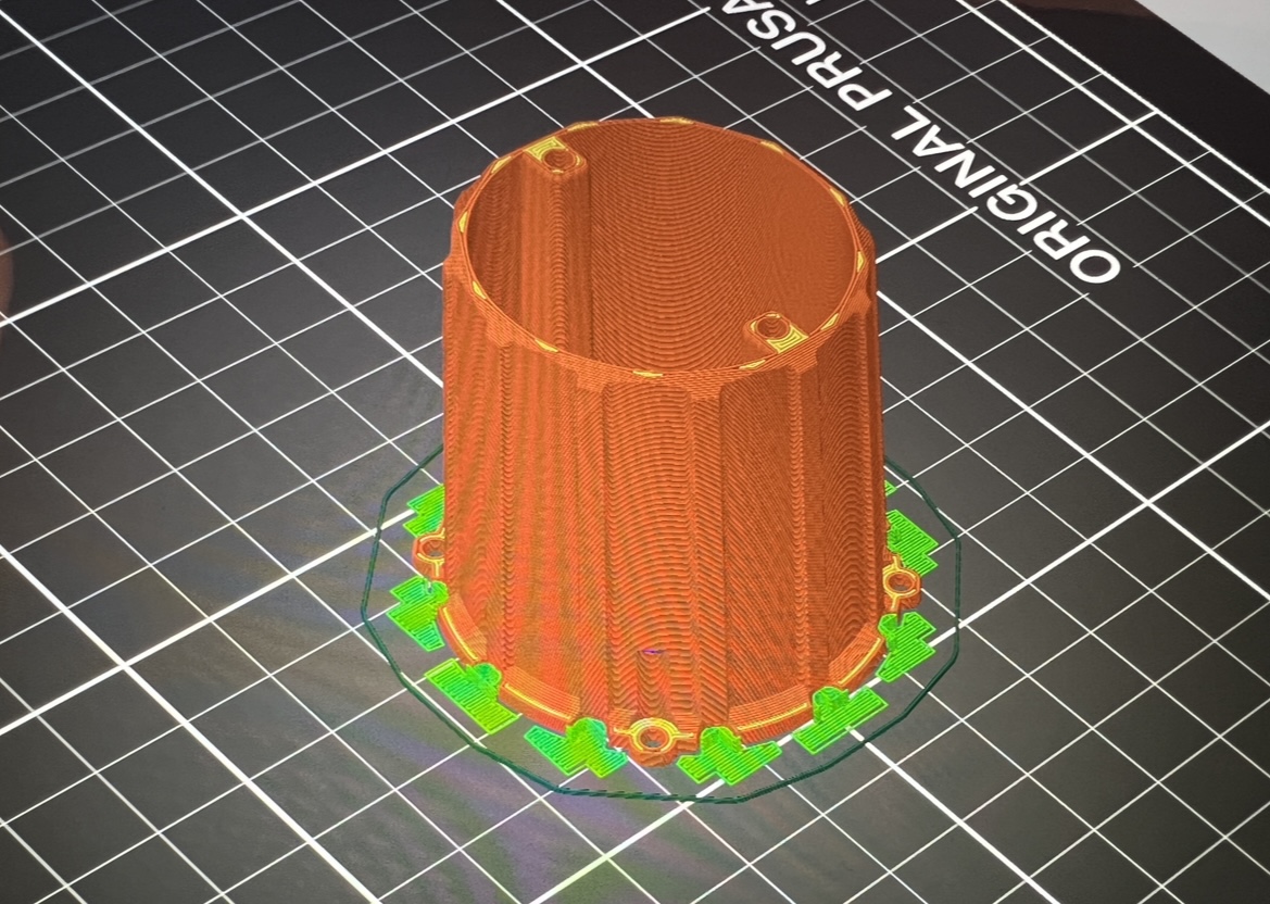 Danke dir für deinen Kommentar:-) Also alle Teile sind aus ASA Farbe Weiß ;-) Alle mit 0.2mm Schichthöhe Konturen 4 mit 0,4er Düse Massive Schichten Boden 4 und Decke 6 Sollte es das Volumen zulassen gibt es ein Infill in Gyroid und 30% Dichte Hab dir Bilder gemacht. Darauf siehst du Orientierung, wenn genutzt Rand um die Fläche der ersten Schicht zu vergrößern (dunkel Grün) und Stützstrukturen (Hellgrün) Hoffe das hilft . Grüße Marco |